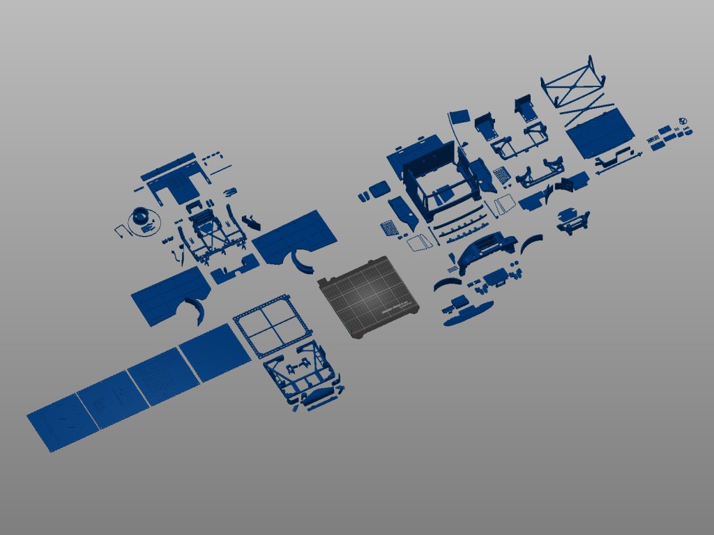 - STL soubory všech potřebných dílu rozmístěných na tiskové podložce